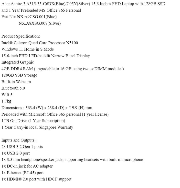 Acer Aspire 3 A315-35-C6DX(Blue)/C05Y(Silver) 15.6 Inches FHD Laptop with 128GB SSD and 1 Year Preloaded MS Office 365 Personal