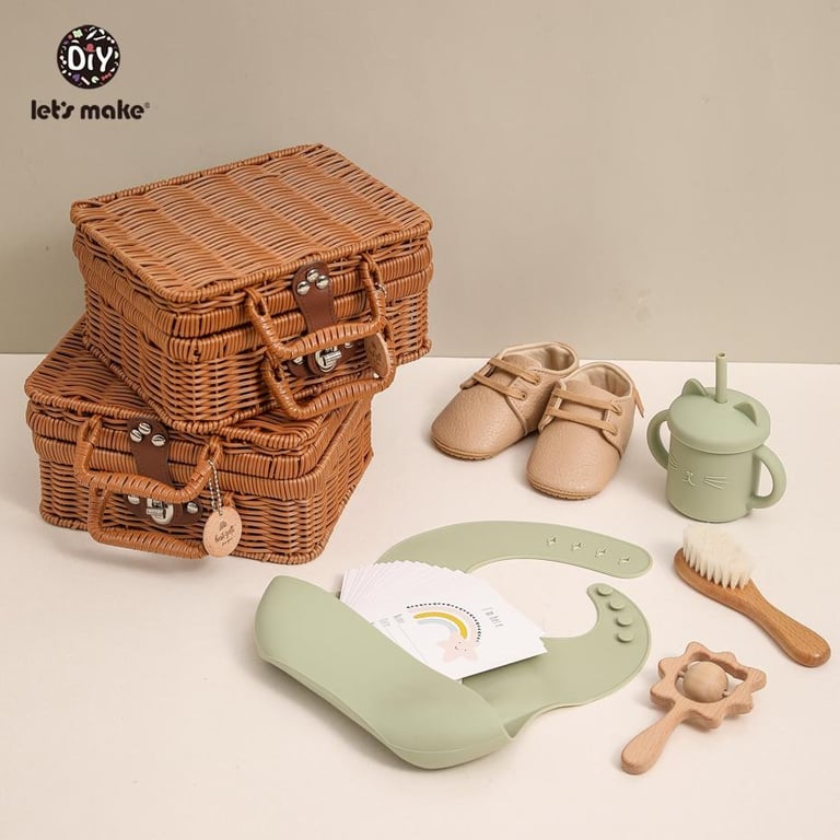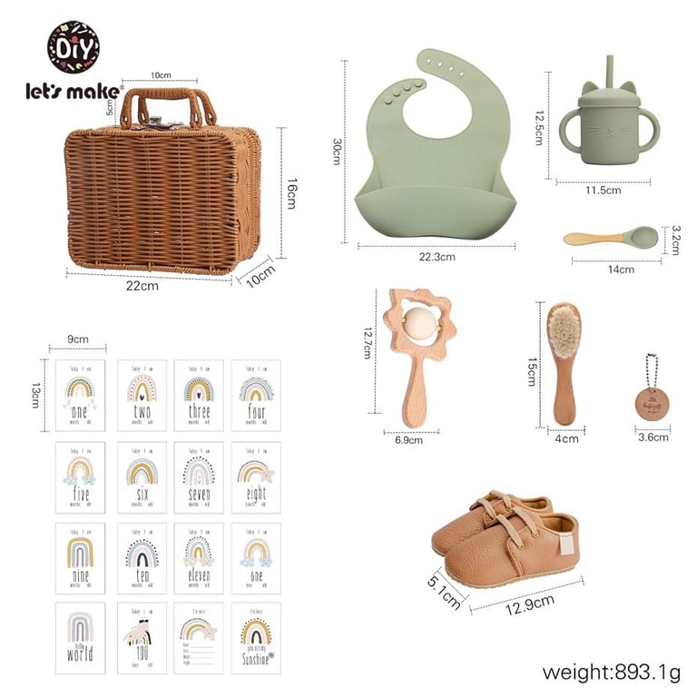 1 x Silicone Bib,1 x Silicone Spoon,1 x Sippy Cup,1 x Wooden Brush,1 x Wooden Rattle,1 x Baby Shoes,16 x Milestone Cards,1 x Rattan Box