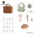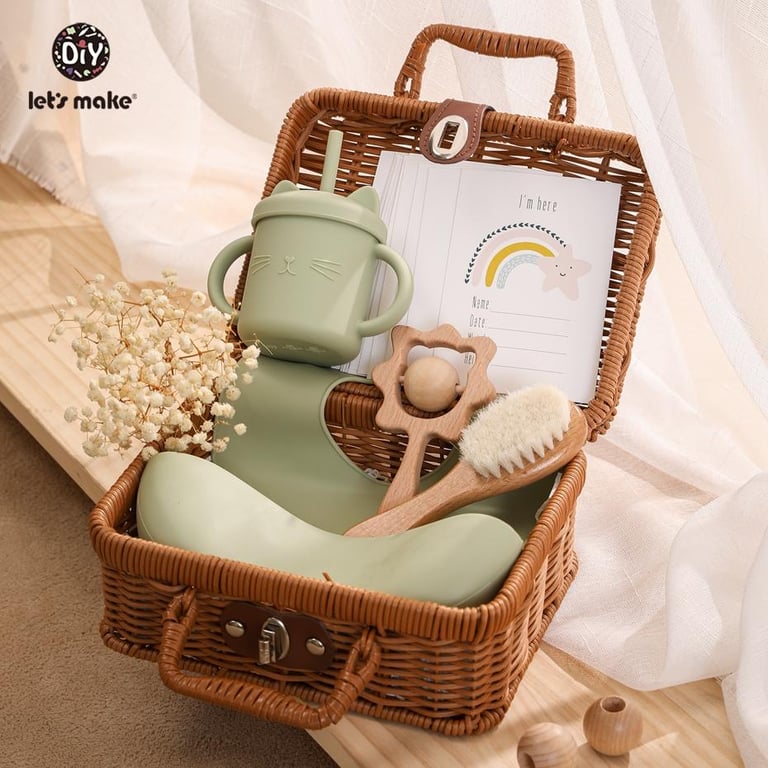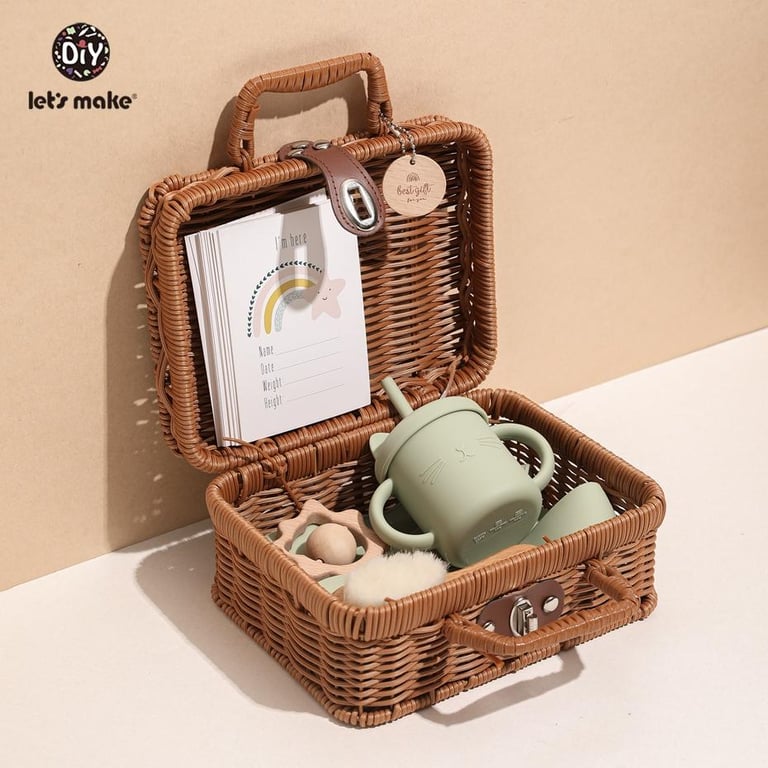 1 x Silicone Bib,1 x Silicone Spoon,1 x Sippy Cup,1 x Silicone Bowl,1 x Silicone Building Block,1 x Rattan Box,16 x Milestone Cards